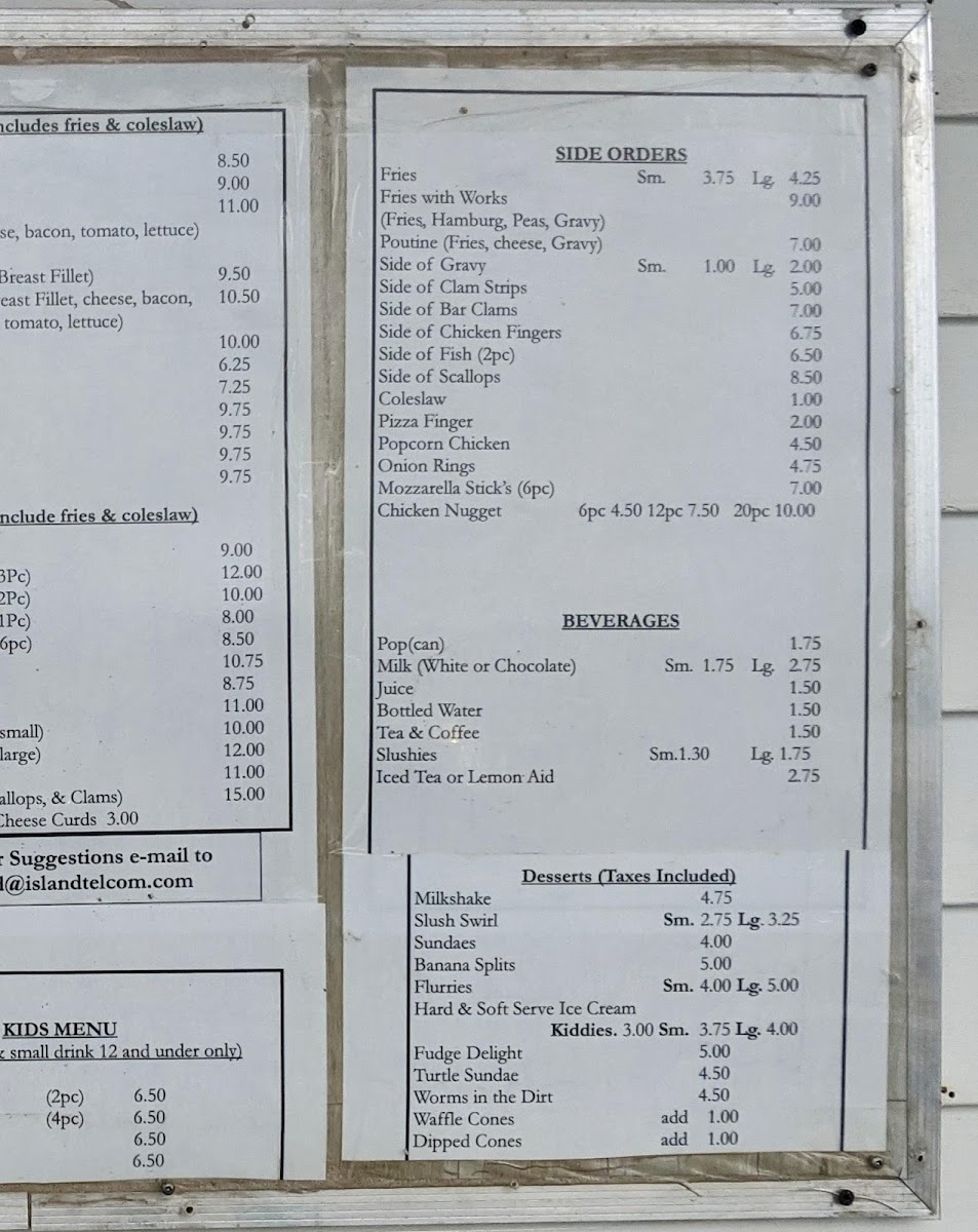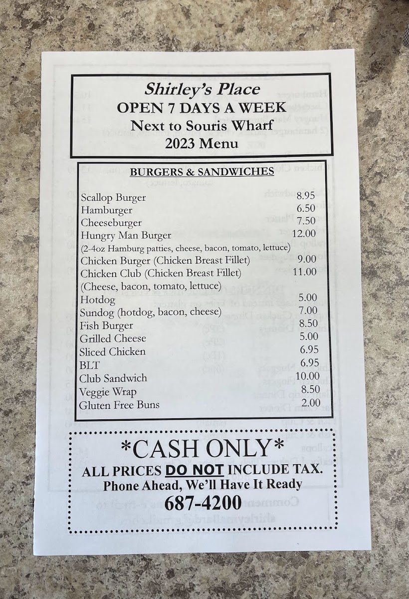 Shirley’s Place, located at 45 Macphee Ave in Souris, PE, offers a diverse and flavorful menu that caters to a wide range of tastes, ensuring that everyone finds something to enjoy. Starting with the platters, you can indulge in a classic Hamburger or a Cheeseburger, or go for the hearty Hungry Man Burger Meal for those with a bigger appetite. For a lighter option, try the Chicken Burger or the savory Chicken Club. These platters come with fries, and you can opt for Onion Rings instead of fries to add a crispy twist.