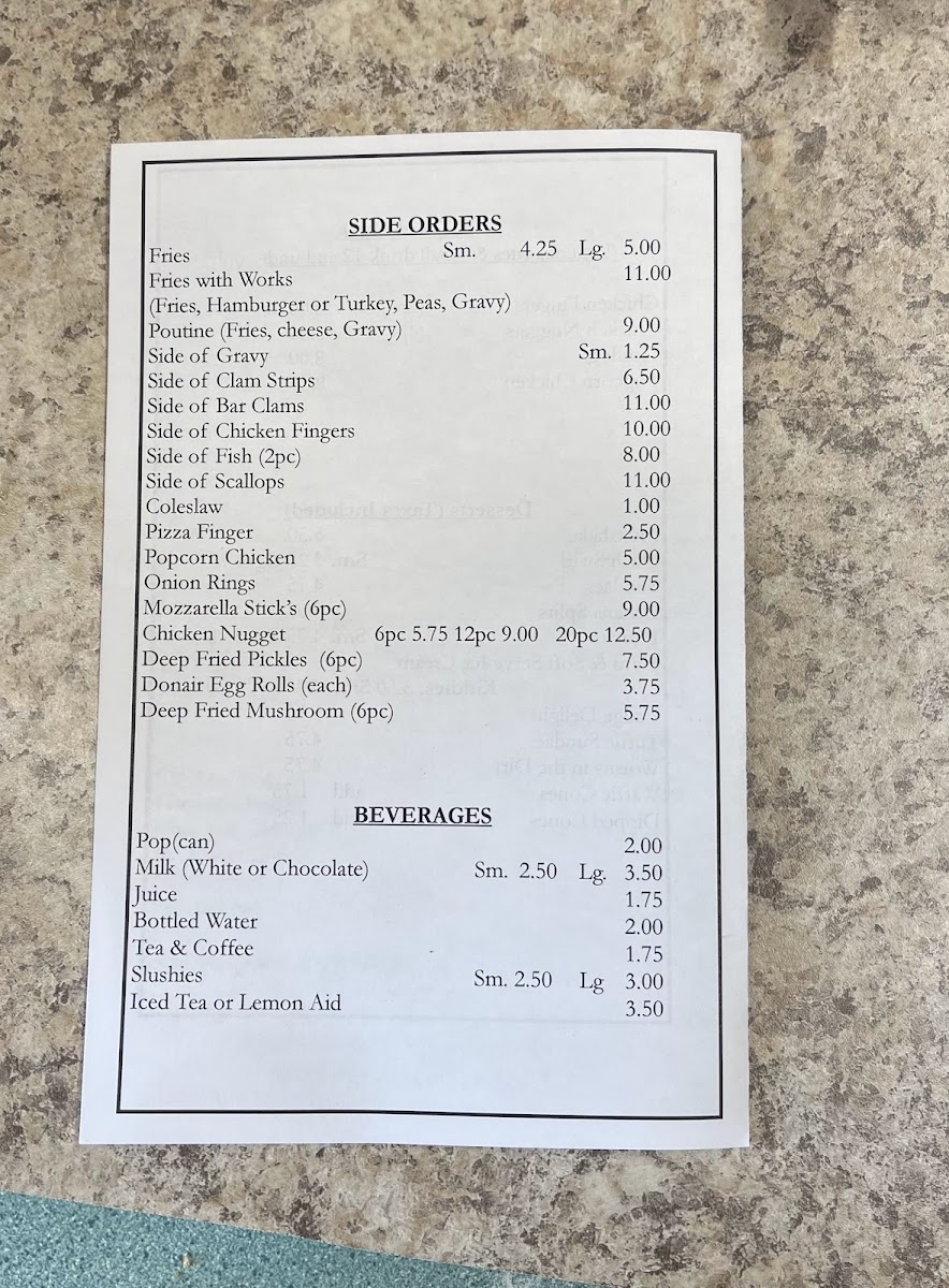 Side options include crispy Fries or Fries With Works, adding extra toppings to your meal. For something extra indulgent, try the Poutine, or a Side of Gravy or Clam Strips to complement your meal.