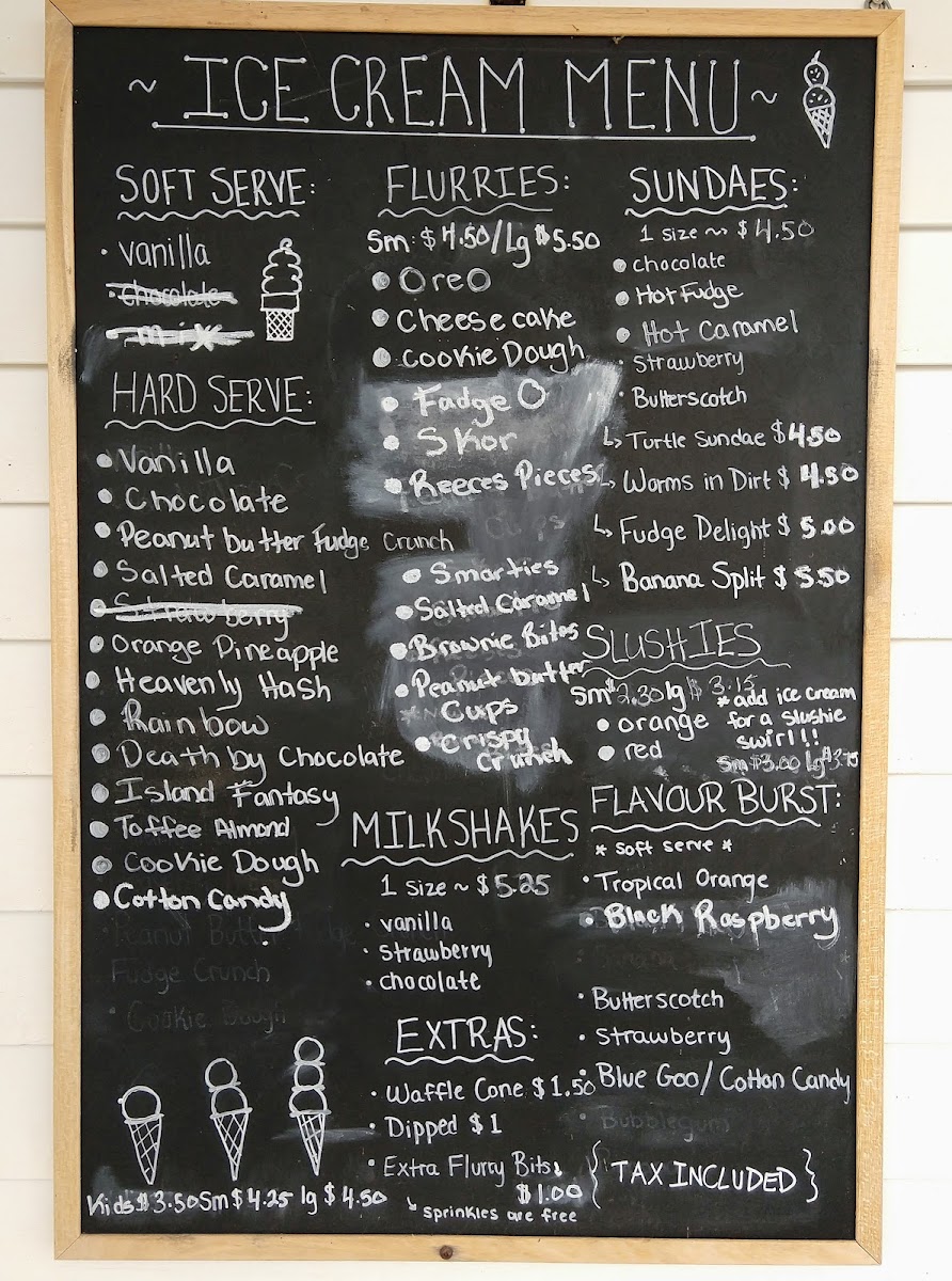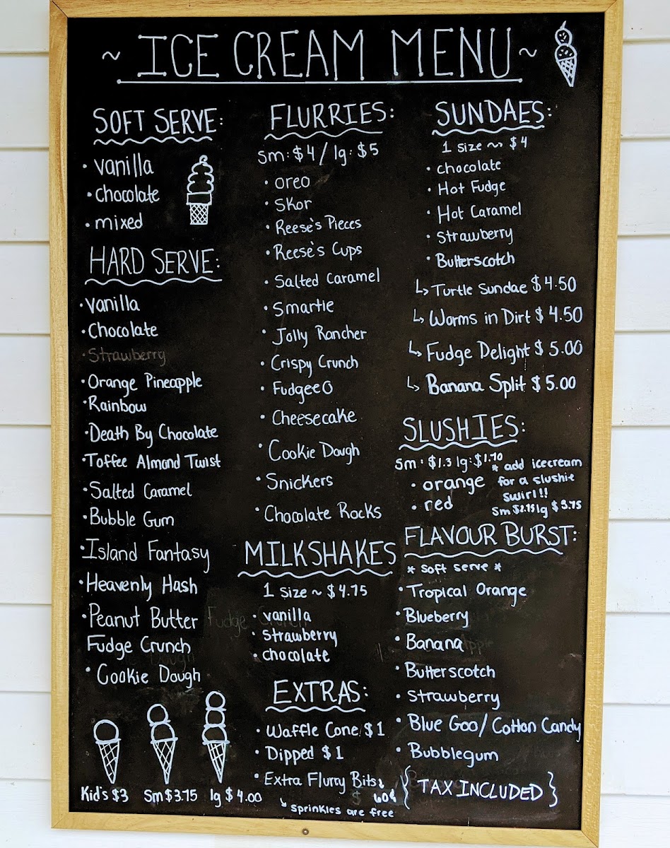 When it comes to Soft Serve, enjoy classic Vanilla or explore the Hard Serve options such as Vanilla, Chocolate, Peanut Butter Fudge, and Salted Caramel. The Flurries and Sundaes are also available in fun flavors like Brownie Bites, Smarties, Chocolate, and Hot Fudge.